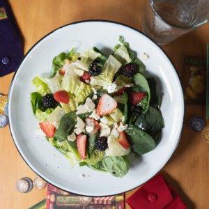 150 g de pechuga de pollo con cobertura crujiente, ensalada